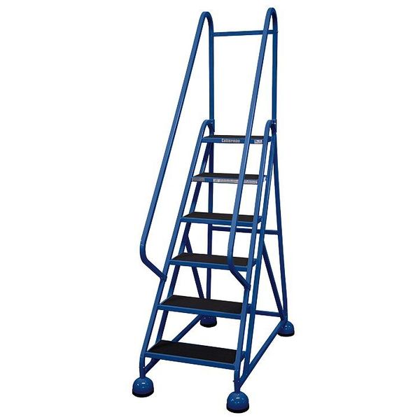 $1,407.49 / eachWeb price84 in H Steel Rolling Ladder, 6 StepsSKU G9808382Categories Material HandlingDescription Rolling Ladder, Material Steel, Platform Height 54 in, Handrails Included Yes, Handrail Height 30 in, Overall Height 84 in, Number of Steps 6, Unassembled, Load Capacity 450 lb, Step Tread Antislip Vinyl, Platform Depth 14 in, Platform Width 16 in, Bottom Width 27 in, Base Depth 53 in, Overall Width 27 in, Climbing Angle 59 Degrees , Step Depth 8 in, Step Width 16 in, Ladder Actuation Weight Activated Step Lock, Finish Powder Coated, Color Blue, Standards ANSI, OSHA, Includes Double HandrailsgraingerSKU: 6MXL7, mscSKU: , zoro_no: G9808382, mongo_id: 65bbe82a22d7a989a98dd567
