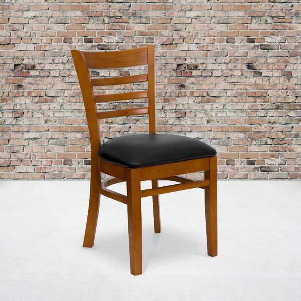 Ladder Back Cherry Wood Restaurant Chair, Black Vinyl Seat, PK2