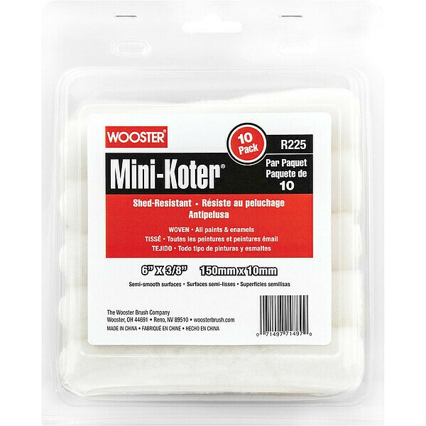 SKU G710354643Categories Paint and Body EquipmentDescription Mini Paint Roller Cover, Cover Type Mini, Surface Texture Semi-Smooth, Compatible Roller Frame Style Rod, 6 in Overall Length, 3/8 in Nap Size, Surface Material Drywall, Paint Type All Paints, Core Diameter 1/4 in, Cover Material Woven Fabric, For Use With Rod Style Frames, Package Quantity 10graingerSKU: , mscSKU: , zoro_no: G710354643, mongo_id: 65bbe9f322d7a989a9988155