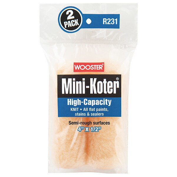 $3.44 / eachWeb price4" Mini Paint Roller Cover, 1/2" Nap, Knit Fabric, 2 PKSKU G1274255Categories Paint and Body EquipmentDescription Mini Paint Rollers, Cover Type Mini, Surface Texture Semi-Rough, Compatible Roller Frame Style Wire, 4 in Overall Length, 1/2 in Nap Size, Surface Material Drywall, Masonry, Wood, Paint Type Flat Paints, Stains, Core Diameter 1/4 in, Cover Material Knit Fabric, Package Quantity 2graingerSKU: 69AR02, mscSKU: , zoro_no: G1274255, mongo_id: 65bbe98022d7a989a995ce97
