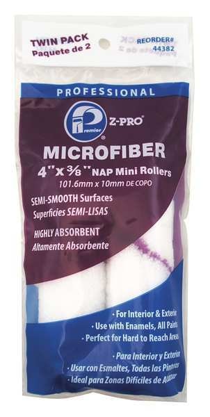 $5.19 / eachWeb price4" Mini Paint Roller Cover, 3/8" Nap, Microfiber, 2 PKSKU G9013785Categories Paint and Body EquipmentDescription Mini Paint Rollers, Cover Type Mini, Surface Texture Semi-Smooth, Compatible Roller Frame Style Wire, 4 in Overall Length, 3/8 in Nap Size, Surface Material Drywall, Paint Type All Paints, Enamels, Core Diameter 5/8 in, Cover Material Microfiber, Core Material Polypropylene, Package Quantity 2graingerSKU: 34AN76, mscSKU: 42085555, zoro_no: G9013785, mongo_id: 65bbe7a79a749db82274ce34