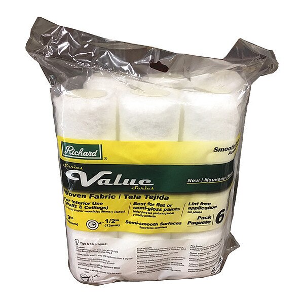 9" Paint Roller Cover, 1/2" Nap, Woven Fabric, 6 PK