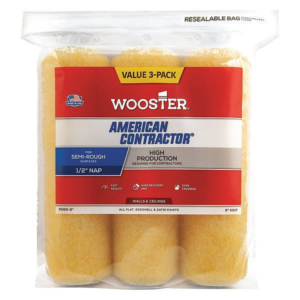 $12.49 / eachWeb price9" Paint Roller Cover, 1/2" Nap, Knit Fabric, 3 PKSKU G7724288Categories Paint and Body EquipmentDescription Roller, Cover Type Standard, Surface Texture Semi-Rough, Compatible Roller Frame Style Cage, 9 in Overall Length, 1/2 in Nap Size, Surface Material Drywall, Masonry, Metal, Wood, Paint Type Flat Paints, Eggshell Paints, Satin Paints, Core Diameter 1 1/2 in, Cover Material Knit Fabric, Package Quantity 3graingerSKU: 60NP92, mscSKU: , zoro_no: G7724288, mongo_id: 65bbe7393aaddbd5a908194d