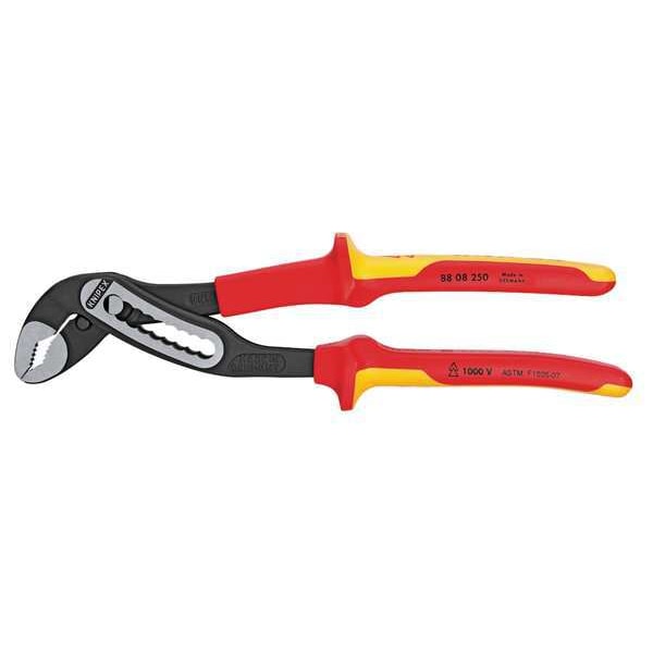 $52.82 / eachWeb priceInsulated Water Pump Pliers, 10"SKU G1456034Categories Hand Tools , PumpsDescription Water Pump Plier, Plier Type Tongue & Groove Pliers, Adjustment Mechanism Groove Joint, Jaw Shape V, Overall Length 10 in, Maximum Jaw Opening 2 in, Number of Jaw Positions 9, Jaw Width 1 1/4 in, Jaw Length 1 1/2 in, Non-Sparking No, Insulated No, Voltage Rating 1000V, Tether Ready No, Features Self-Locking, Hardened Teeth To 61 Hrc, Box-Joint Design, High Stability Double Guide, Pinch Guard, Thin Jaw Profile, Finish Polished, Jaw Opening Type Manual, Plier Material SteelgraingerSKU: 2DZD3, mscSKU: 71399240, zoro_no: G1456034, mongo_id: 65bbe6bb3aaddbd5a904c681
