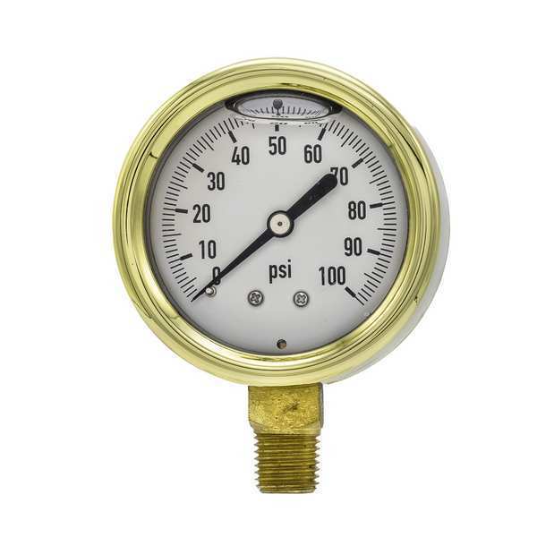 Pressure Gauge, 0 to 100 psi, 1/4 in MNPT, Brass, Gold