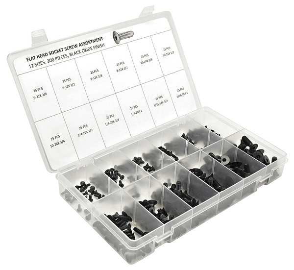 Cap Screw Assortment, Alloy Steel, Black Oxide FinishSKU G4217297Categories Raw MaterialsDescription Cap Screw Assortment, Finish Black Oxide, Head Type Flat, Drive External Hex, Number of Sizes 12, Number of Pieces 300, Material Alloy Steel, Pack Size Small, System of Measurement Inch, Container Material Plastic, Includes (25) Each: 6-32x3/8 in, 6-32x1/2 in, 8-32x3/8 in, 8-32x1/2 in, 10-24x3/8 in, 10-24x1/2 in, 10-24x3/4 in, 1/4-20x1/2 in, 1/4 In.-20x3/4 in, 1/4 In.-20x1 in, 5/16 In.-18x3/4 in, 5/16 In.-18x1 in, Plastic Case, Includes Flat Washers No, Includes Hex Head Screws NograingerSKU: 1.30E+73, mscSKU: , zoro_no: G4217297, mongo_id: 65bbea5222d7a989a99a9359