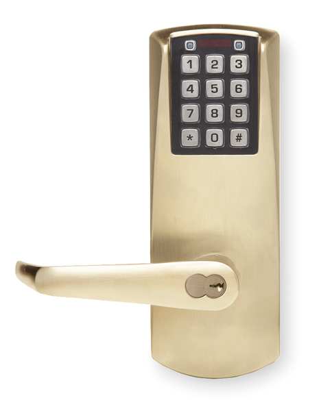 Electronic Lock, Satin Brass, 12 ButtonSKU G1425505Categories Raw MaterialsDescription Electronic Keyless Lock, Function Entry with Key Override, Access Method Keypad, Mounting Style Cylindrical, Lock Material Solid Cast, Finish Satin Brass, Series E2000, Handle Type Lever, Door Thickness 1-3/8 in to 2-1/2 in, Key Override Options Best and Equivalents, Hand Nonhanded, Outside Height 8 15/16 in, Outside Width 3 5/16 in, Outside Depth 2 3/16 in, Keypad Material Solid Metal, Power Source (3) AA Batteries, Battery Life Up to 100,000 CyclesgraingerSKU: 1NEZ8, mscSKU: , zoro_no: G1425505, mongo_id: 65bbee17526e052139aec53d