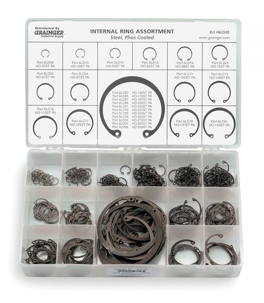 SKU G2938415Categories Raw MaterialsDescription Retaining Ring Assortment,240 pcs, System of Measurement Metric, Ring Type Housing Ring, Material Steel, Finish Black Phosphate, Material Grade/Class Ungraded, Number of Pieces 240, Number of Sizes 12, Location Style Internal, Made in North America Yes, Manufacturer Location Made in USA*, Material Quality Standards DIN472graingerSKU: 4KGD3, mscSKU: , zoro_no: G2938415, mongo_id: 65bbee11526e052139aeab02
