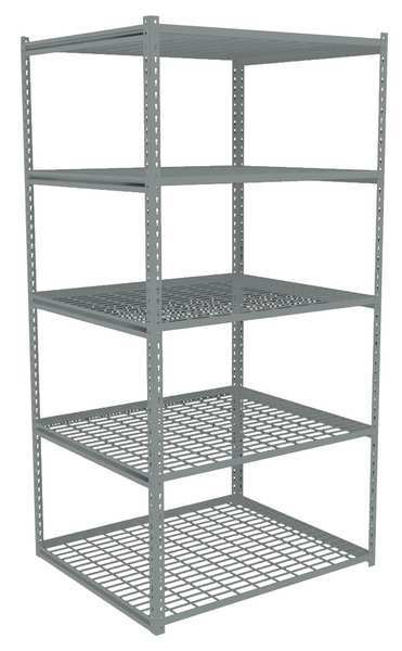 $569.99 / eachWeb priceBoltless Shelving Unit, 36"D x 48"W x 84"H, 5 Shelves, Carbon SteelSKU G9876693Categories Raw MaterialsDescription Boltless Shelving, Low Profile, Overall Depth 36 in, Overall Height 84 in, Overall Width 48 in, Shelf Gauge 14 ga, Shelf Adjustment Increments 1 1/2 in, Steel, Steel, Steel, (20) Beams, (4) Posts, Includes Decking Yes, 500 lb, Whole Unit Load Capacity 2,500 lb, Starter, Open, SCS Indoor Advantage(R) Certified, Post Gauge 14 ga, Number of Shelves 5, Maximum Post Load Capacity 8,000 lb with Beams Evenly Spaced at 24 in, Powder Coated, Light-Duty, GraygraingerSKU: 44P765, mscSKU: , zoro_no: G9876693, mongo_id: 65bbe7d23aaddbd5a90badf6