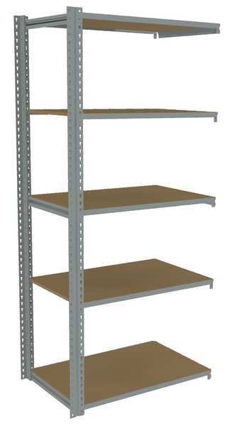 $327.49 / eachWeb priceBoltless Shelving, 24"D x 36"W x 84"H, 5 Shelves, Carbon SteelSKU G1972420Categories Raw MaterialsDescription Boltless Shelving, Low Profile, Overall Depth 24 in, Overall Height 84 in, Overall Width 36 in, Shelf Gauge 14 ga, Shelf Adjustment Increments 1 1/2 in, Steel, Particleboard, Steel, (2) Posts, (5) Low Profile Deck Levels, Includes Decking Yes, 600 lb, Whole Unit Load Capacity 3,000 lb, Add-On, Open, Post Gauge 16 ga, Number of Shelves 5, Maximum Post Load Capacity 8,000 lb with Beams Evenly Spaced at 24 in, Powder Coated, Light-Duty, GraygraingerSKU: 36K435, mscSKU: , zoro_no: G1972420, mongo_id: 65bbe7863aaddbd5a909e18a