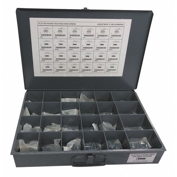SKU G3761970Categories Raw MaterialsDescription Nut and Screw Assortment, Finish Zinc Plated, Head Type Round, Drive Slotted, Number of Sizes 24, Number of Pieces 1,200, Material Steel, Pack Size Small, System of Measurement Inch, Container Material Metal, Head Style Round, Hex Nuts Included #10-24, #10-32, #12-24, #6-32, #8-32, 1/4 in-20graingerSKU: 402K57, mscSKU: , zoro_no: G3761970, mongo_id: 65bbe7bb3aaddbd5a90b0f5e