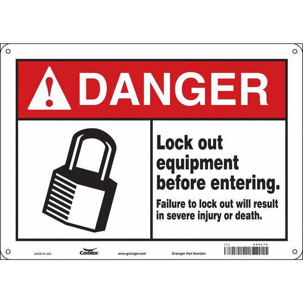 Safety Sign, 10 in Height, 14 in Width, Aluminum, Horizontal Rectangle, English, 469L76SKU G5093370Categories SafetyDescription Safety Sign, Horizontal Rectangle, Number of Printed Sides 1, English, Sign Format ANSI/OSHA Format, Sign Legend Lock Out Equipment Before Entering. Failure To Lock Out Will Result In Severe Injury Or Death., Sign Legend Background Color White, Sign Legend Style Symbol and TextgraingerSKU: 469L76, mscSKU: , zoro_no: G5093370, mongo_id: 65bbe91d22d7a989a9935975