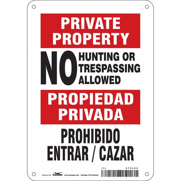 Safety Sign, 10 in Height, 7 in Width, Aluminum, Horizontal Rectangle, English, Spanish, 473L92SKU G5599172Categories SafetyDescription Safety Sign, Horizontal Rectangle, Number of Printed Sides 1, English, Spanish, Sign Format Other Format, Sign Legend No Hunting Or Trespassing Allowed/Propiedad Privada Prohibido Entrar/Cazar, Sign Legend Background Color Red, White, Sign Legend Style TextgraingerSKU: 473L92, mscSKU: , zoro_no: G5599172, mongo_id: 65bbe91d22d7a989a99358bd