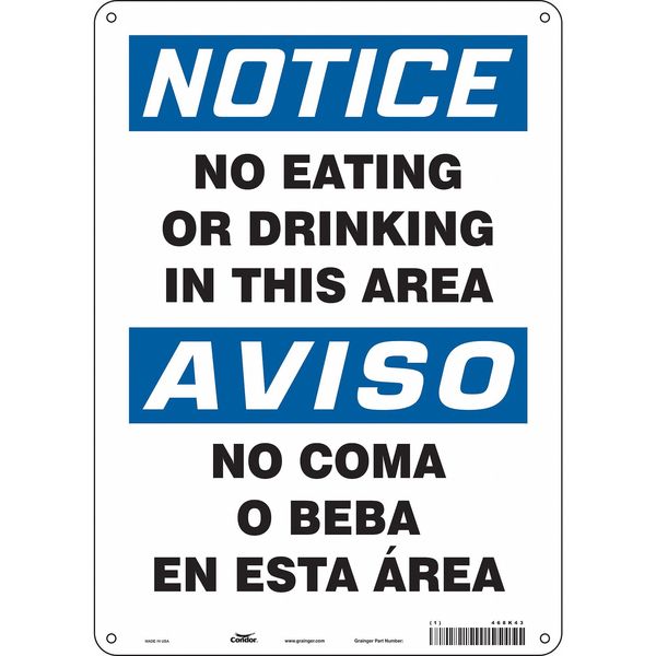 SKU G5641750Categories SafetyDescription Safety Sign, Vertical Rectangle, Number of Printed Sides 1, English, Spanish, Sign Format Traditional OSHA, Sign Legend No Eating Or Drinking In This Area/No Coma O Beba En Esta Area, Sign Legend Background Color White, Sign Legend Style TextgraingerSKU: 468K43, mscSKU: , zoro_no: G5641750, mongo_id: 65bbe91d22d7a989a993583a