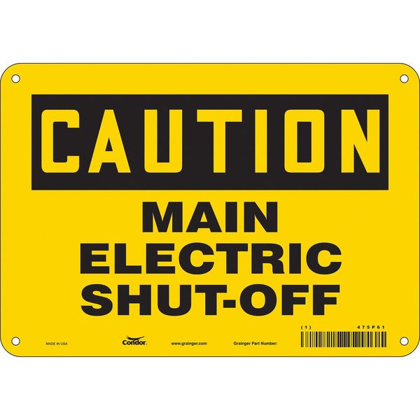 Safety Sign, 7 in Height, 10 in Width, Aluminum, Vertical Rectangle, English, 475P61SKU G5603442Categories SafetyDescription Safety Sign, Vertical Rectangle, Number of Printed Sides 1, English, Sign Legend Main Electric Shut-Off, Sign Legend Background Color Yellow, Sign Legend Style TextgraingerSKU: 475P61, mscSKU: , zoro_no: G5603442, mongo_id: 65bbe91d22d7a989a9935884