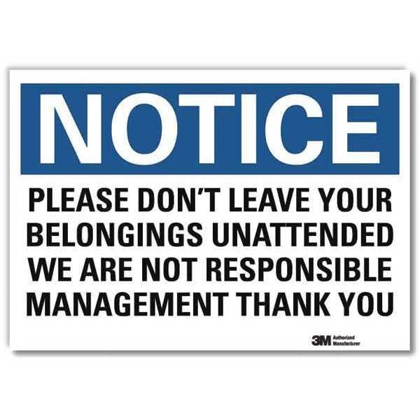 Notice Sign, 10 in H, 14 in W, Reflective Sheeting, Horizontal Rectangle, English, U5-1450-RD_14X10SKU G2758765Categories SafetyDescription Notice Sign, Horizontal Rectangle, Number of Printed Sides 1, English, Sign Format Traditional OSHA, Sign Legend Please Don't Leave Your Belongings Unattended. We Are Not Responsible., Sign Legend Background Color White, Sign Legend Style TextgraingerSKU: 34JV14, mscSKU: , zoro_no: G2758765, mongo_id: 65bbe91d22d7a989a9935532
