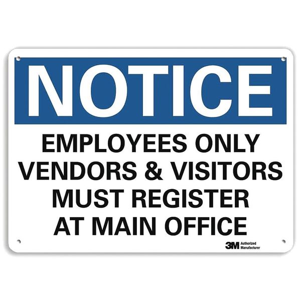 $10.61 / eachWeb priceNotice Sign, 7 in H, 10 in W, Aluminum, Vertical Rectangle, English, U5-1194-RA_10X7SKU G2762910Categories SafetyDescription Notice Sign, Vertical Rectangle, Number of Printed Sides 1, English, Sign Legend Employees Only Vendors & Visitors Must Register At Main Office, Sign Legend Background Color White, Sign Legend Style TextgraingerSKU: 34JL89, mscSKU: , zoro_no: G2762910, mongo_id: 65bbe8339a749db82277b56e