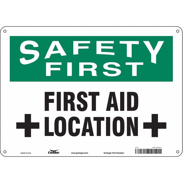 First Aid Sign, 14" Wx10" H, 0.032" Thick, 471V27SKU G5093842Categories SafetyDescription First Aid Sign, Horizontal Rectangle, Number of Printed Sides 1, English, Sign Legend First Aid Location, Sign Legend Background Color White, Sign Legend Style Symbol and TextgraingerSKU: 471V27, mscSKU: , zoro_no: G5093842, mongo_id: 65bbe8f722d7a989a9927559