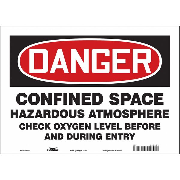Safety Sign, 10 in Height, 14 in Width, Vinyl, Horizontal Rectangle, English, 465L30SKU G5130452Categories SafetyDescription Safety Sign, Horizontal Rectangle, Number of Printed Sides 1, English, Sign Format Traditional OSHA, Sign Legend Confined Space Hazardous Atmosphere Check Oxygen Level Before And During Entry, Sign Legend Background Color White, Sign Legend Style TextgraingerSKU: 465L30, mscSKU: , zoro_no: G5130452, mongo_id: 65bbe8f722d7a989a9927626