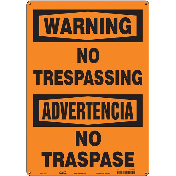 SKU G5569991Categories SafetyDescription Safety Sign, Vertical Rectangle, Number of Printed Sides 1, English, Spanish, Sign Format Traditional OSHA, Sign Legend No Trespassing/No Traspase, Sign Legend Background Color Orange, Sign Legend Style TextgraingerSKU: 473N23, mscSKU: , zoro_no: G5569991, mongo_id: 65bbe8f722d7a989a9927615