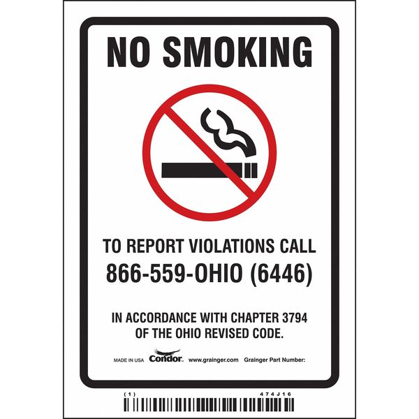 SKU G5505059Categories SafetyDescription Safety Sign, Vertical Rectangle, Number of Printed Sides 1, English, Sign Format Other Format, Sign Legend No Smoking To Report Violations Call 866-559-Ohio (6446) In Accordance With Chapter 3794 Of The Ohio Revised Code., Sign Legend Background Color White, Sign Legend Style Symbol and TextgraingerSKU: 474J16, mscSKU: , zoro_no: G5505059, mongo_id: 65bbe8f722d7a989a99274d2
