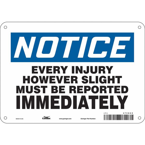 Safety Sign, 7 in Height, 10 in Width, Aluminum, Vertical Rectangle, English, 475G65SKU G5650132Categories SafetyDescription Safety Sign, Vertical Rectangle, Number of Printed Sides 1, English, Sign Format Traditional OSHA, Sign Legend Every Injury However Slight Must Be Reported Immediately, Sign Legend Background Color White, Sign Legend Style TextgraingerSKU: 475G65, mscSKU: , zoro_no: G5650132, mongo_id: 65bbe8f722d7a989a99275cd