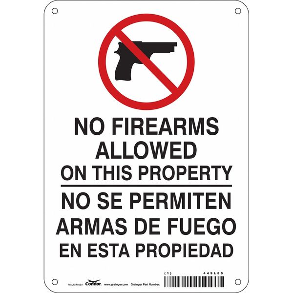 Safety Sign, 10 in Height, 7 in Width, Aluminum, Horizontal Rectangle, English, Spanish, 449L85SKU G5864201Categories SafetyDescription Safety Sign, Horizontal Rectangle, Number of Printed Sides 1, English, Spanish, Sign Legend No Firearms Allowed On This Property/No Se Permiten Armas De Fuego En Esta Propiedad, Sign Legend Background Color White, Sign Legend Style Symbol and TextgraingerSKU: 449L85, mscSKU: , zoro_no: G5864201, mongo_id: 65bbe8f722d7a989a9927585