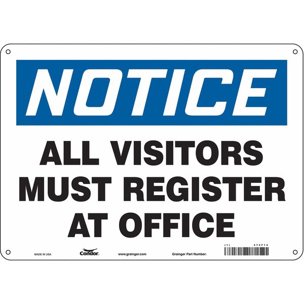 Safety Sign, 10 in Height, 14 in Width, Aluminum, Horizontal Rectangle, English, 472F14SKU G5059317Categories SafetyDescription Safety Sign, Horizontal Rectangle, Number of Printed Sides 1, English, Sign Legend All Visitors Must Register At Office, Sign Legend Background Color White, Sign Legend Style TextgraingerSKU: 472F14, mscSKU: , zoro_no: G5059317, mongo_id: 65bbe8f722d7a989a99274c1