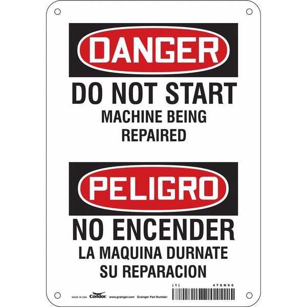 Safety Sign, 10 in Height, 7 in Width, Aluminum, Horizontal Rectangle, English, Spanish, 478N66SKU G5855853Categories SafetyDescription Safety Sign, Horizontal Rectangle, Number of Printed Sides 1, English, Spanish, Sign Format Traditional OSHA, Sign Legend Do Not Start Machine Being Repaired/No Encender La Maquina Mientras Este En Reparacion, Sign Legend Background Color White, Sign Legend Style TextgraingerSKU: 478N66, mscSKU: , zoro_no: G5855853, mongo_id: 65bbe8f722d7a989a99275ad