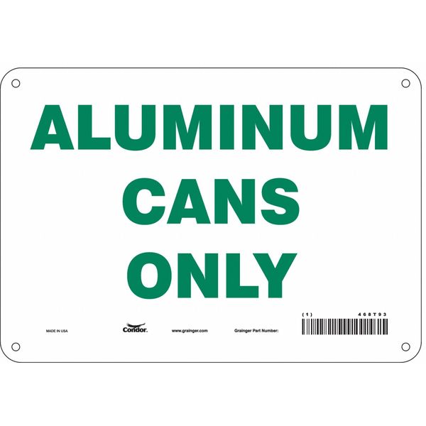SKU G5609970Categories SafetyDescription Safety Sign, Vertical Rectangle, Number of Printed Sides 1, English, Sign Format Other Format, Sign Legend Aluminum Cans Only, Sign Legend Background Color White, Sign Legend Style Text Safety Sign, 7 in Height, 10 in Width, Aluminum, Vertical Rectangle, English, 468T93