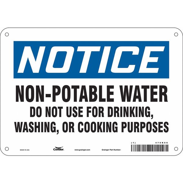 Safety Sign, 7 in Height, 10 in Width, Aluminum, Vertical Rectangle, English, 470K06SKU G5608388Categories SafetyDescription Safety Sign, Vertical Rectangle, Number of Printed Sides 1, English, Sign Format Traditional OSHA, Sign Legend Non-Potable Water Not To Be Used For Drinking, Washing Or Cooking Purposes, Sign Legend Background Color White, Sign Legend Style TextgraingerSKU: 470K06, mscSKU: , zoro_no: G5608388, mongo_id: 65bbe8d122d7a989a9918f17