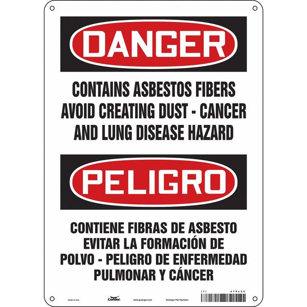 Safety Sign, 14 in Height, 10 in Width, Aluminum, Vertical Rectangle, English, Spanish, 479L20SKU G5900601Categories SafetyDescription Safety Sign, Vertical Rectangle, Number of Printed Sides 1, English, Spanish, Sign Format Traditional OSHA, Sign Legend Contains Asbestos Fibers Avoid Creating Dust - Cancer And Lung Disease Hazard/Contiene Fibras De Asbesto Evitar La Formacion De Polvo - Peligro De Enfermedad Pulmonar Y Cancer, Sign Legend Background Color White, Sign Legend Style TextgraingerSKU: 479L20, mscSKU: , zoro_no: G5900601, mongo_id: 65bbe8d122d7a989a9918e4a