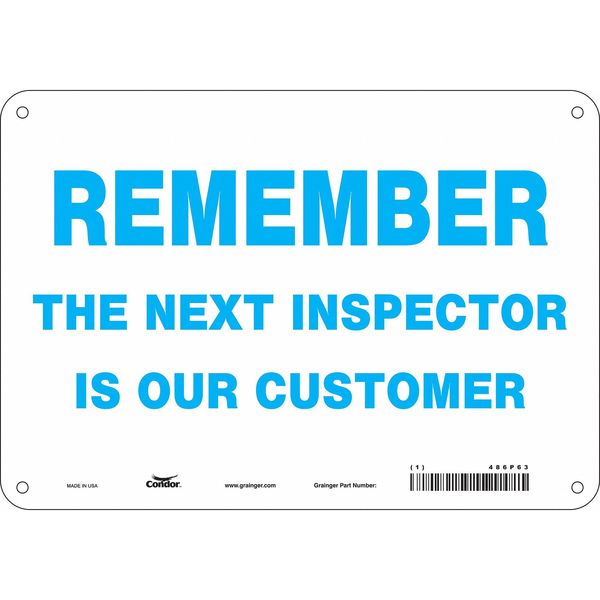 Safety Sign, 7 in Height, 10 in Width, Aluminum, Vertical Rectangle, English, 486P63SKU G6256028Categories SafetyDescription Safety Sign, Vertical Rectangle, Number of Printed Sides 1, English, Sign Format Other Format, Sign Legend Remember The Next Inspector Is Our Customer, Sign Legend Background Color White, Sign Legend Style TextgraingerSKU: 486P63, mscSKU: , zoro_no: G6256028, mongo_id: 65bbe8d122d7a989a9918f16