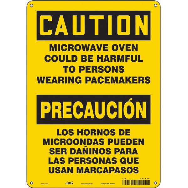 SKU G5258668Categories SafetyDescription Safety Sign, Horizontal Rectangle, Number of Printed Sides 1, English, Spanish, Sign Format Traditional OSHA, Sign Legend Microwave Oven Could Be Harmful To Persons Wearing Pacemakers/Los Hornos De Microondas Pueden Ser Daninos Para Las Personas Que Usan Marcapasos, Sign Legend Background Color Yellow, Sign Legend Style Text Sign Radiofrequency/Microwave, 10" H, 451X28