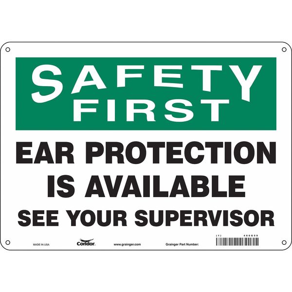 SKU G5895178Categories SafetyDescription Safety Sign, Horizontal Rectangle, Number of Printed Sides 1, English, Sign Format Traditional OSHA, Sign Legend Ear Protection Is Available See Your Supervisor, Sign Legend Background Color White, Sign Legend Style Text Safety Sign, 10 in Height, 14 in Width, Aluminum, Horizontal Rectangle, English, 466G59
