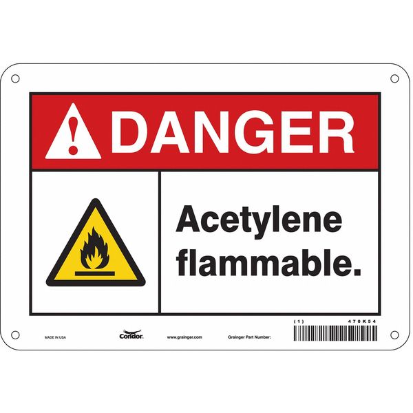SKU G5235732Categories SafetyDescription Safety Sign, Vertical Rectangle, Number of Printed Sides 1, English, Sign Format ANSI/OSHA Format, Sign Legend Acetylene Flammable., Sign Legend Background Color White, Sign Legend Style Symbol and Text Safety Sign, 7 in Height, 10 in Width, Aluminum, Vertical Rectangle, English, 470K54