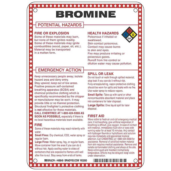 SKU G5687893Categories SafetyDescription Chemical Sign, Bromine Potential Hazards, Fiberglass, Height 10 in, Width 7 in, Header No Header, Legend Style Symbol and Text, Language English, Mounting Style Surface, Thickness 0.1 in, Sign Shape Rectangle, Operating Temp. Range -40 Degrees to 194 Degrees F, Retroreflective Grade Not RetroreflectivegraingerSKU: 41F460, mscSKU: , zoro_no: G5687893, mongo_id: 65bbe8c222d7a989a99131d3