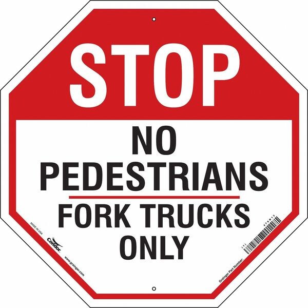 SKU G5814501Categories SafetyDescription Safety Sign, Octagon, Number of Printed Sides 1, English, Sign Format Other Format, Sign Legend Stop No Pedestrians Fork Trucks Only, Sign Legend Background Color Red, White, Sign Legend Style TextgraingerSKU: 476N13, mscSKU: , zoro_no: G5814501, mongo_id: 65bbe8ab22d7a989a990aa77