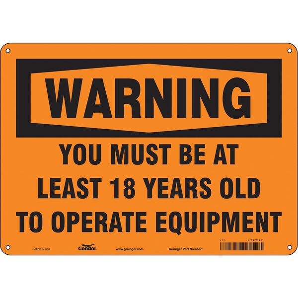 Safety Sign, 10 in Height, 14 in Width, Aluminum, Horizontal Rectangle, English, 478W97SKU G5880660Categories SafetyDescription Safety Sign, Horizontal Rectangle, Number of Printed Sides 1, English, Sign Format Traditional OSHA, Sign Legend You Must Be At Least 18 Years Old To Operate Equipment, Sign Legend Background Color Orange, Sign Legend Style TextgraingerSKU: 478W97, mscSKU: , zoro_no: G5880660, mongo_id: 65bbe8ab22d7a989a990aa7c