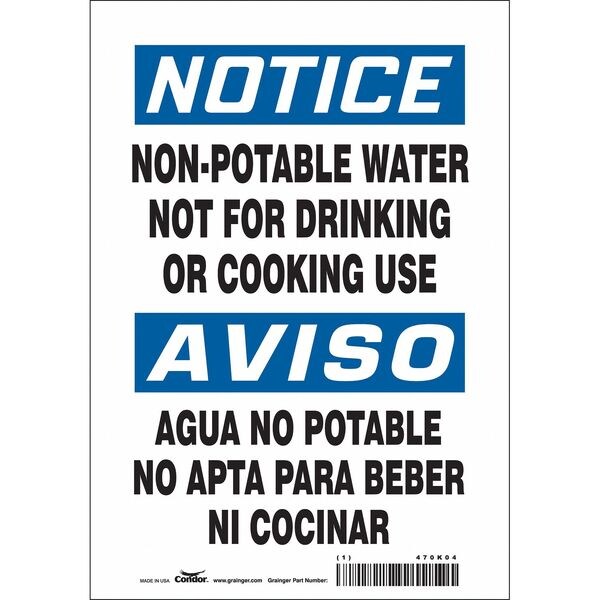 Safety Sign, 10 in Height, 7 in Width, Vinyl, Horizontal Rectangle, English, 470K04SKU G5521317Categories SafetyDescription Safety Sign, Horizontal Rectangle, Number of Printed Sides 1, English, Sign Format Traditional OSHA, Sign Legend Non-Potable Water Not For Drinking Or Cooking Use/Agua No Potable No Apta Para Beber Ni Cocinar, Sign Legend Background Color White, Sign Legend Style TextgraingerSKU: 470K04, mscSKU: , zoro_no: G5521317, mongo_id: 65bbe6983aaddbd5a903da68