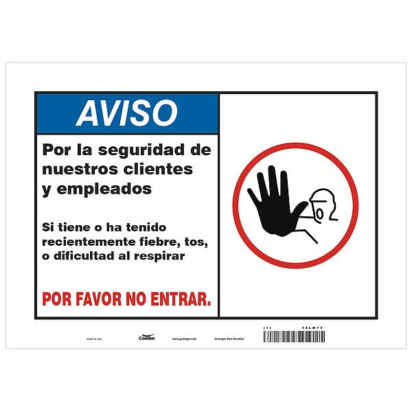 SKU G7661404Categories SafetyDescription Covid 19 Sign 10X14, Spanish Symptoms Do, Sign Subject Matter Coronavirus Prevention, Height 10 in, Width 14 in, Sign Material Aluminum, Sign Mounting Style With Mounting Holes, Header Aviso, Legend Por La Seguridad De Nuestros Clientes Y Empleados; Si Tiene O Ha Tenido Recientemente Fiebre, Tos, O Dificultad De Respirar; Por Favor No Entrar., Printed Language SpanishgraingerSKU: , mscSKU: , zoro_no: G7661404, mongo_id: 65bbe6983aaddbd5a903dabc