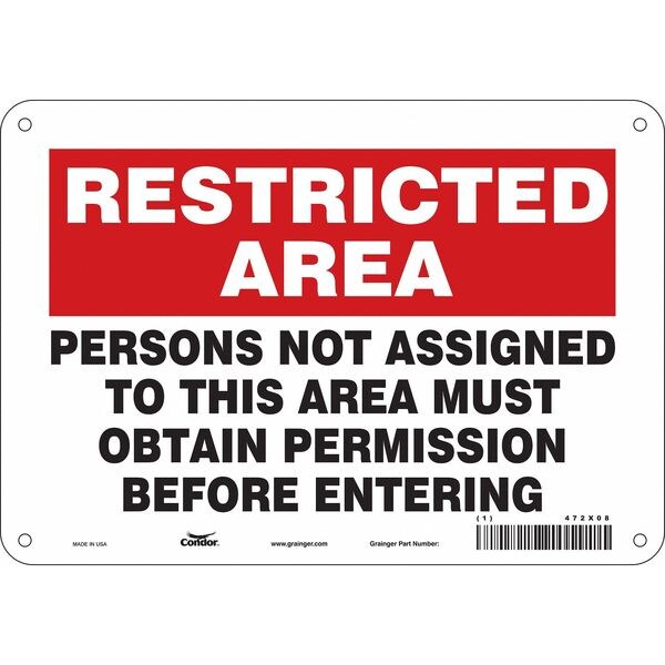 Safety Sign, 7 in Height, 10 in Width, Aluminum, Vertical Rectangle, English, 472X08SKU G5573659Categories SafetyDescription Safety Sign, Vertical Rectangle, Number of Printed Sides 1, English, Sign Format Other Format, Sign Legend Persons Not Assigned To This Area Must Obtain Permission Before Entering, Sign Legend Background Color Red, White, Sign Legend Style TextgraingerSKU: 472X08, mscSKU: , zoro_no: G5573659, mongo_id: 65bbe6983aaddbd5a903dae0