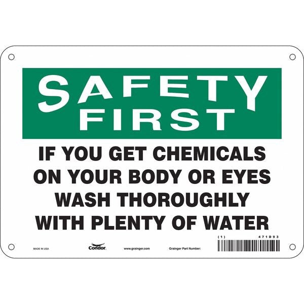 SKU G5207419Categories SafetyDescription Safety Sign, Vertical Rectangle, Number of Printed Sides 1, English, Sign Format Traditional OSHA, Sign Legend If You Get Chemicals On Your Body Or Eyes Wash Thoroughly With Plenty Of Water, Sign Legend Background Color White, Sign Legend Style TextgraingerSKU: 471D93, mscSKU: , zoro_no: G5207419, mongo_id: 65bbe6983aaddbd5a903dab9