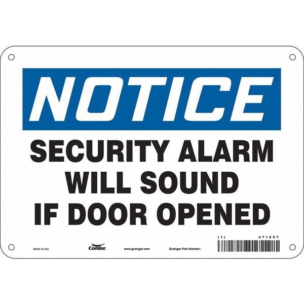 Safety Sign, 10" W x 7" H, 0.032" ThickSKU G5873259Categories SafetyDescription Safety Sign, Vertical Rectangle, Number of Printed Sides 1, English, Sign Format Traditional OSHA, Sign Legend Security Alarm Will Sound If Door Is Opened, Sign Legend Background Color White, Sign Legend Style TextgraingerSKU: 471Z07, mscSKU: , zoro_no: G5873259, mongo_id: 65bbe6983aaddbd5a903d934