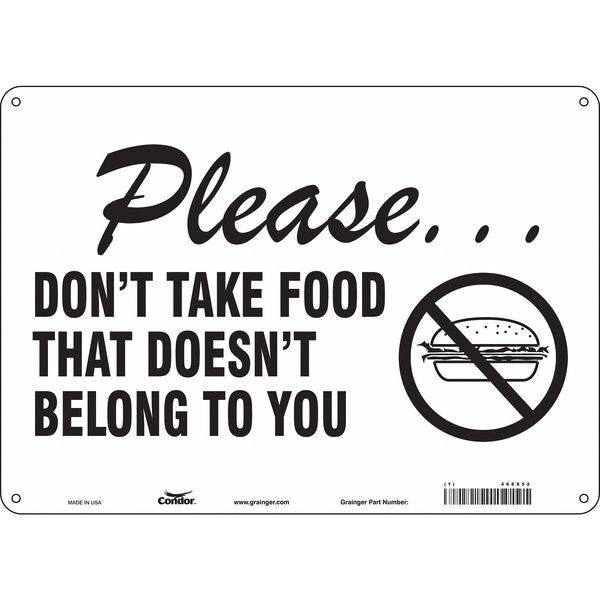 Safety Sign, 10 in Height, 14 in Width, Aluminum, Horizontal Rectangle, English, 468X52SKU G5268291Categories SafetyDescription Safety Sign, Horizontal Rectangle, Number of Printed Sides 1, English, Sign Format Other Format, Sign Legend Please Don't Take Food That Doesn't Belong To You, Sign Legend Background Color White, Sign Legend Style Symbol and TextgraingerSKU: 468X52, mscSKU: , zoro_no: G5268291, mongo_id: 65bbe6983aaddbd5a903d96f