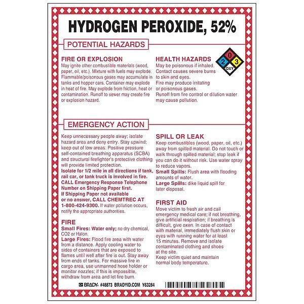 SKU G5820132Categories SafetyDescription Chemical Sign, Hydrogen Peroxide, 52 Percent Potential Hazards, Fiberglass, Height 10 in, Width 7 in, Header No Header, Legend Style Symbol and Text, Language English, Mounting Style Surface, Thickness 0.1 in, Sign Shape Rectangle, Operating Temp. Range -40 Degrees to 194 Degrees F, Retroreflective Grade Not RetroreflectivegraingerSKU: 41F484, mscSKU: , zoro_no: G5820132, mongo_id: 65bbe95522d7a989a994c89d