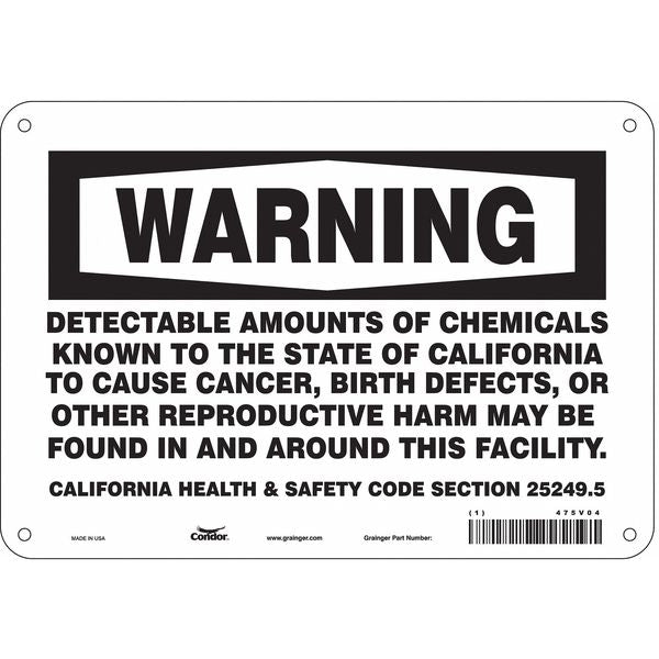 SKU G5772809Categories SafetyDescription Safety Sign, DETECTABLE AMOUNTS OF CHEMICALS KNOWN TO THE STATE OF CALIFORNIA TO CAUSE CANCER, BIRTH DEFECTS, OR OTHER REPRODUCTIVE HARM MAY BE FOUND IN AND AROUND THIS FACILITY. CALIFORNIA HEALTH & SAFETY CODE SECTION 25249.5, Aluminum, Height 7 in, Width 10 in, Header No Header, Legend Style Text, Thickness 0.032 in, Sign Shape Rectangle, Operating Temp. Range -40 Degrees to 140 Degrees F, Retroreflective Grade Not RetroreflectivegraingerSKU: 475V04, mscSKU: , zoro_no: G5772809, mongo_id: 65bbe95522d7a989a994c901