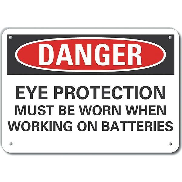SKU G9497909Categories SafetyDescription Plastic Eye Danger Sign, Horizontal Rectangle, Number of Printed Sides 1, English, Sign Format Traditional OSHA, Sign Legend Eye Protection Must Be Worn When Working On Batteries, Sign Legend Background Color White, Sign Legend Style TextgraingerSKU: 64RU01, mscSKU: , zoro_no: G9497909, mongo_id: 65bbe91d22d7a989a993556c