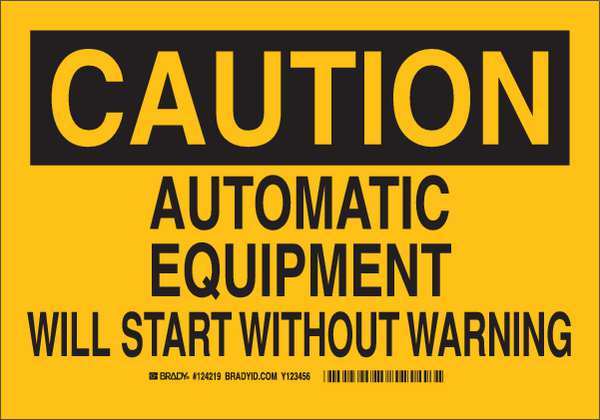 SKU G8631837Categories SafetyDescription Caution Sign, Sign Subject Matter Machine and Operational, Height 7 In., Width 10 In., Sign Material Aluminum, Header Caution, Legend Automatic Equipment Will Start Without Warning, Printed Language English, Sign Shape Rectangle$18.56 / eachWeb priceCaution Sign, 7" Height, 10" Width, Aluminum, Rectangle, EnglishSKU G8631837Categories SafetyDescription Caution Sign, Sign Subject Matter Machine and Operational, Height 7 In., Width 10 In., Sign Material Aluminum, Header Caution, Legend Automatic Equipment Will Start Without Warning, Printed Language English, Sign Shape Rectangle$18.56 / eachWeb price -