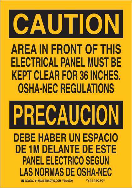 SKU G8463837Categories SafetyDescription Safety Sign, Sign Subject Matter Electrical Hazard, Height 10 in, Width 7 in, Sign Material Polyester, Header Caution/Precaucion, Legend Area In Front Of This Electrical Panel Must Be Kept Clear For 36 Inches. OSHA-Nec Regulations/Deb Haber Un Espacio De 1M Delante De Este Panel Electrico Segun Las Normas De OSHA-Nec, Printed Language English, Spanish, Sign Shape Rectangle$11.49 / eachWeb priceBilingual Sign, 10X7", Black/Yellow, 125339SKU G8463837Categories SafetyDescription Safety Sign, Sign Subject Matter Electrical Hazard, Height 10 in, Width 7 in, Sign Material Polyester, Header Caution/Precaucion, Legend Area In Front Of This Electrical Panel Must Be Kept Clear For 36 Inches. OSHA-Nec Regulations/Deb Haber Un Espacio De 1M Delante De Este Panel Electrico Segun Las Normas De OSHA-Nec, Printed Language English, Spanish, Sign Shape Rectangle$11.49 / eachWeb price -
